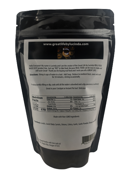 Delicious lentils with yummy garlic, onions, sweet baby carrots, onions, celery with a touch of garlic salt.